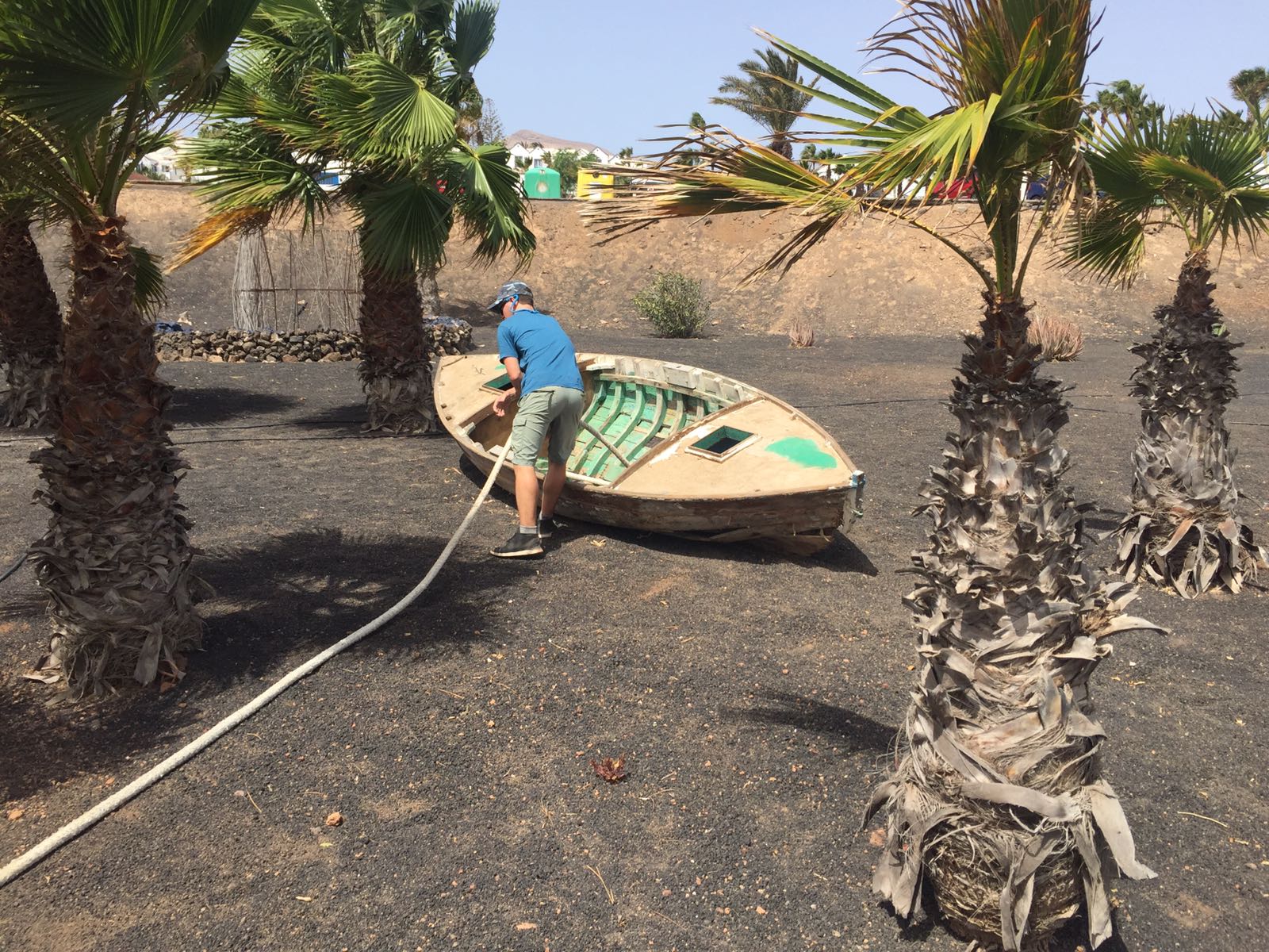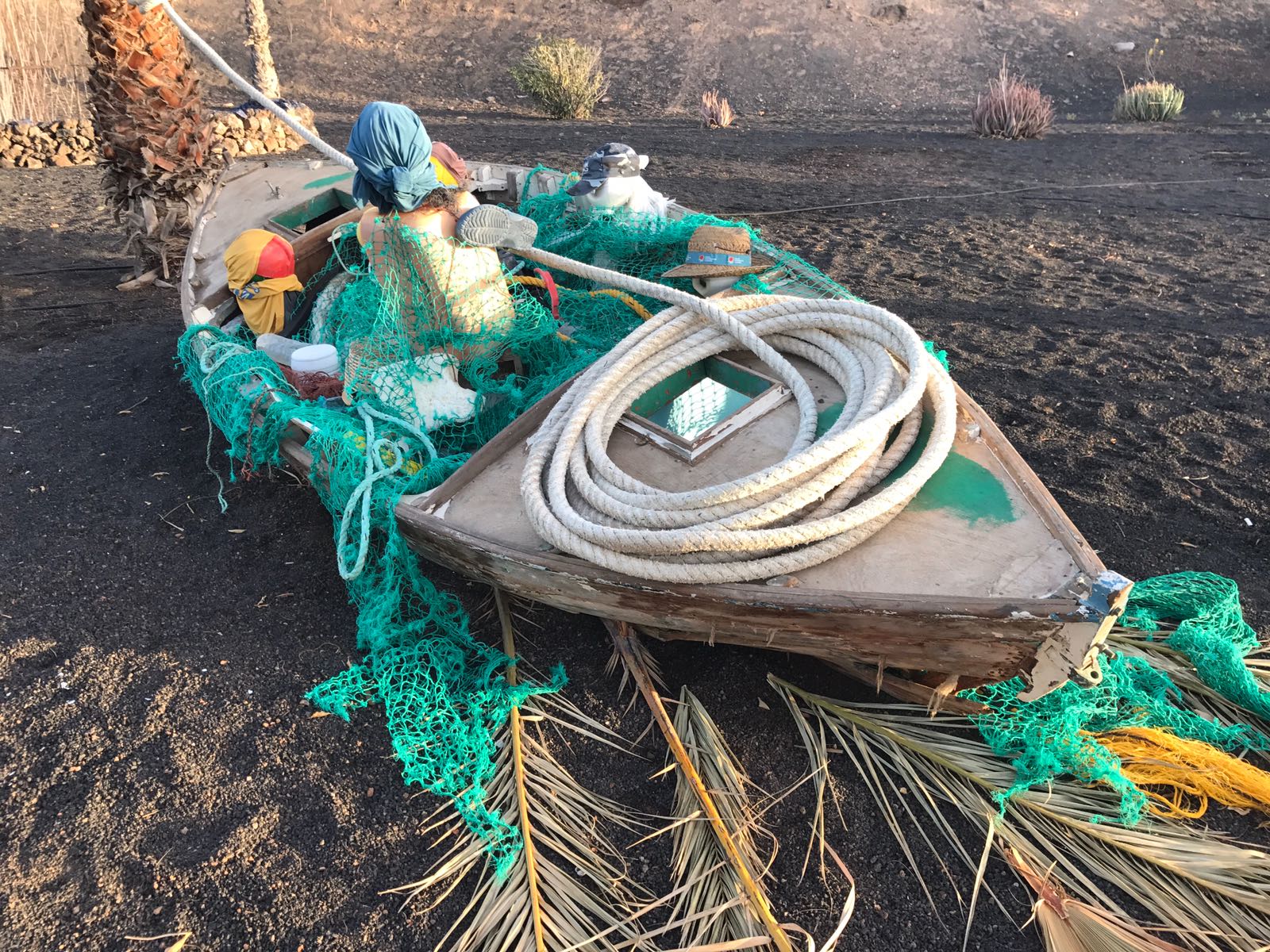We don’t even know how many times Ethan has been here. We only know that he is a person committed with the environment and a man of the world who one day is in Japan, another one in Hawaii, another one in Lanzarote… and another one in the middle of the ocean doing research on tuna fish, his specialty. And on top of that, he is a good friend of us. Here you have «Los naurfagos/The castaways», made from waste found in different places in the island.