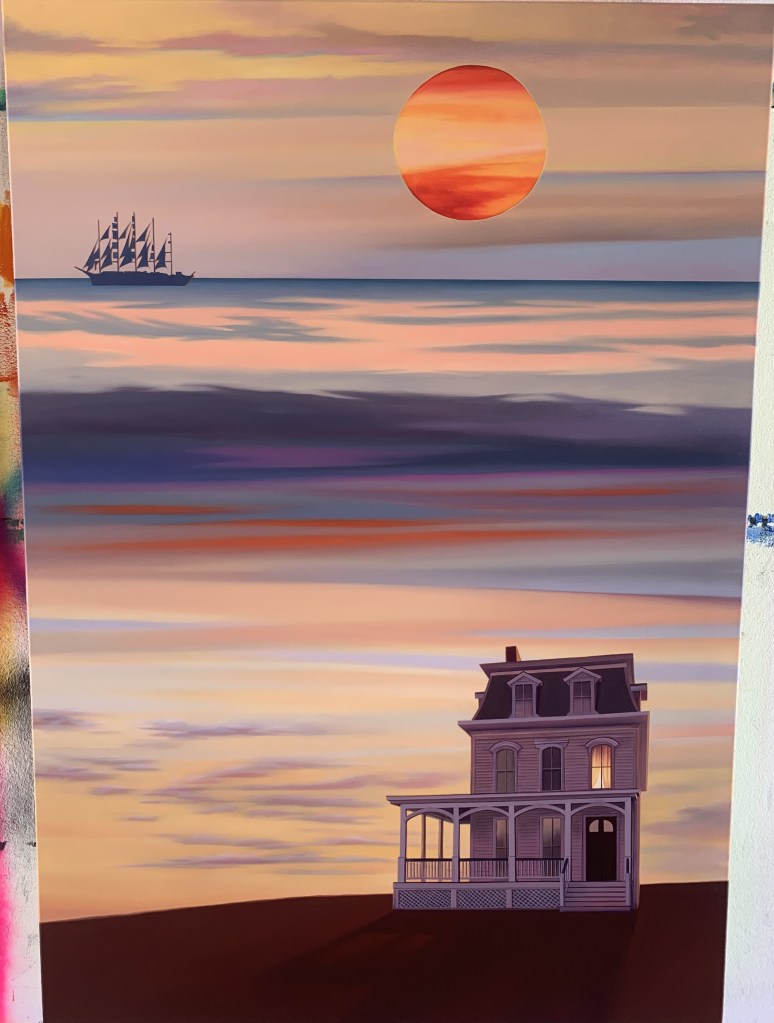 Methodical as she is, her work takes us to novels and movies marked by mystery. There is also a dreamlike and surreal part in her work and a special care in the use of color that has led on this occasion to also turn the palette that she has used during her stay at the residence into a work of art. On the other hand, she likes to capture images with exuberant vegetation but this time, Juana has located the house in a place bare of vegetation with a tone similar to that of the island landscape.