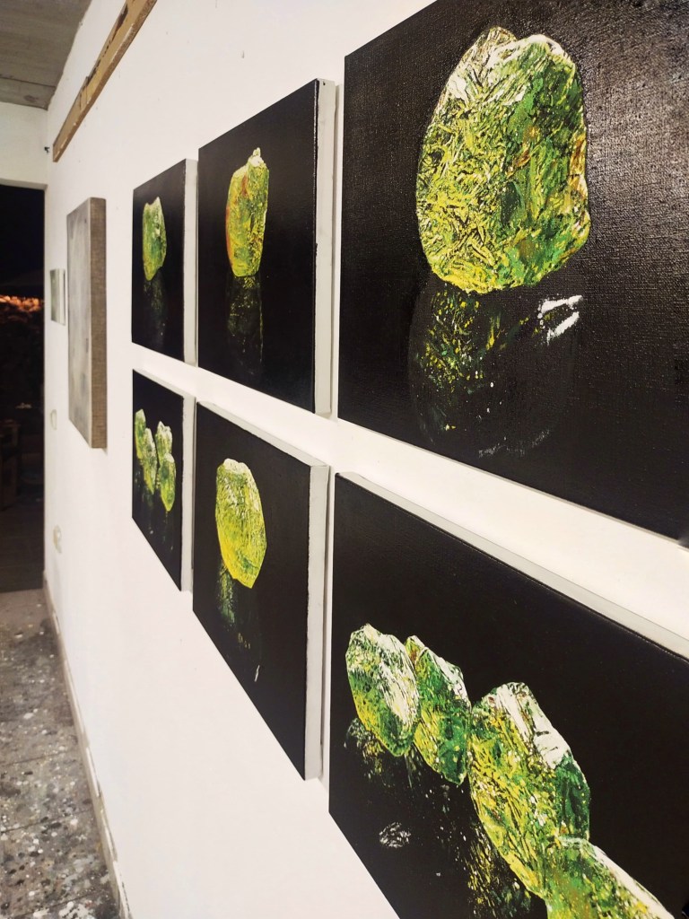 In his previous research work on Lanzarote, Quique discovered the legend of the olivine and decided to develop his project around this green stone, which appears in his works full of light, reflections and contrasts