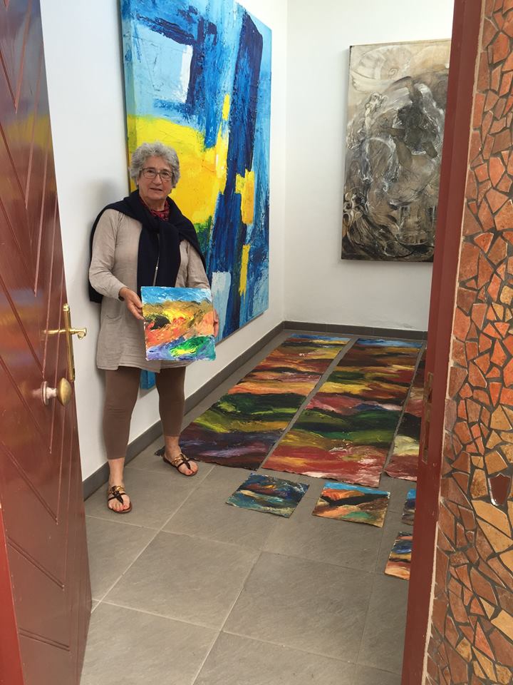 En esta segunda visita, Josette Dacosta ha decidido hacer partícipe de su obra al viento que tanto caracteriza a Lanzarote y en lugar de hacer cuadros se ha puesto en marcha para hacer unas banderolas a colocar en el jardín que da al paseo marítimo. Aquí vemos parte de dicha aventura: